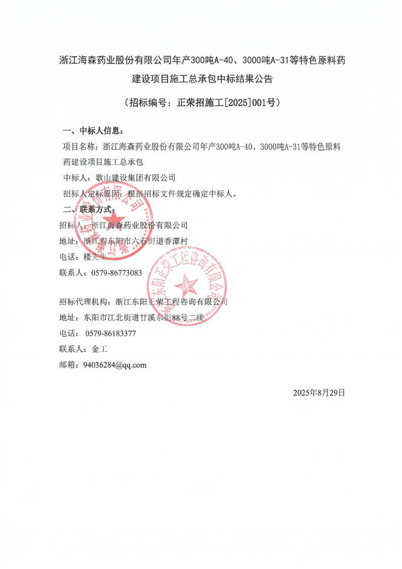 海森药业--新区建设--建设项目施工总承包中标结果公告